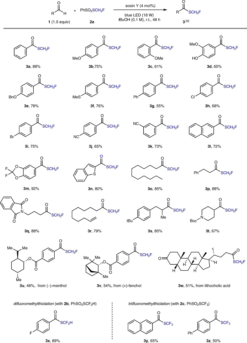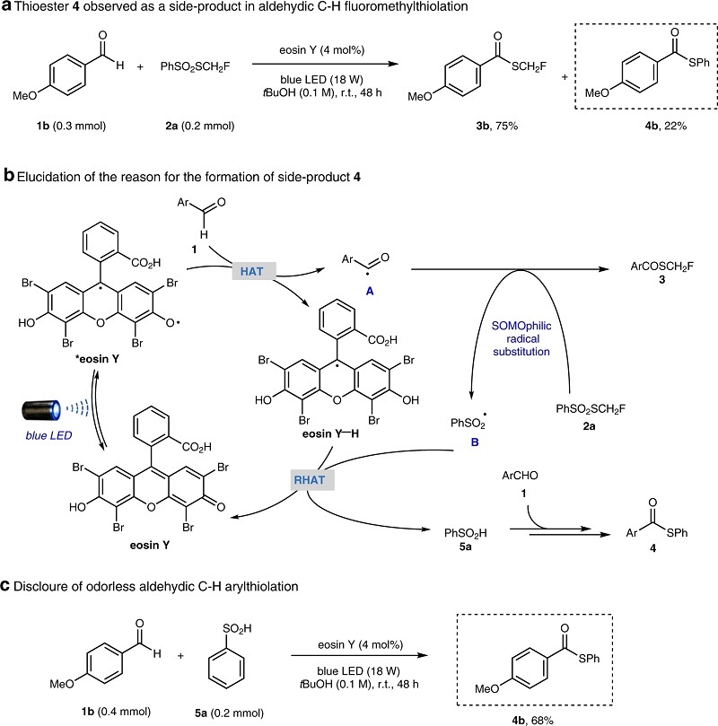 (a)在醛基C-H氟甲基硫醇化反应中观察到作为副产物的硫酯4;