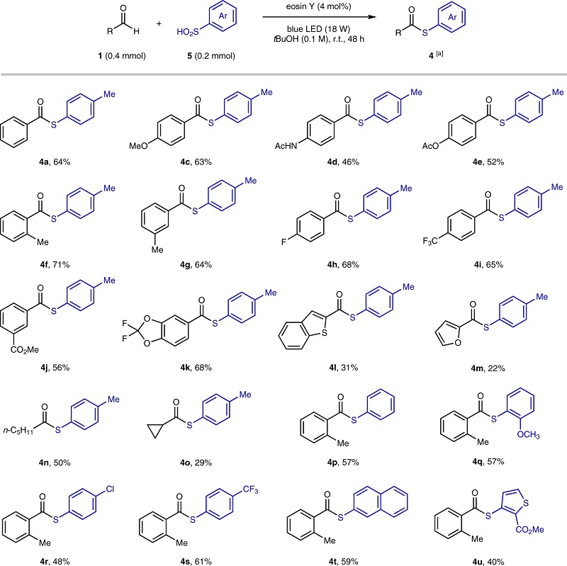 图三、利用芳基亚磺酸作为无味硫试剂实现醛基C-H硫醇化反应