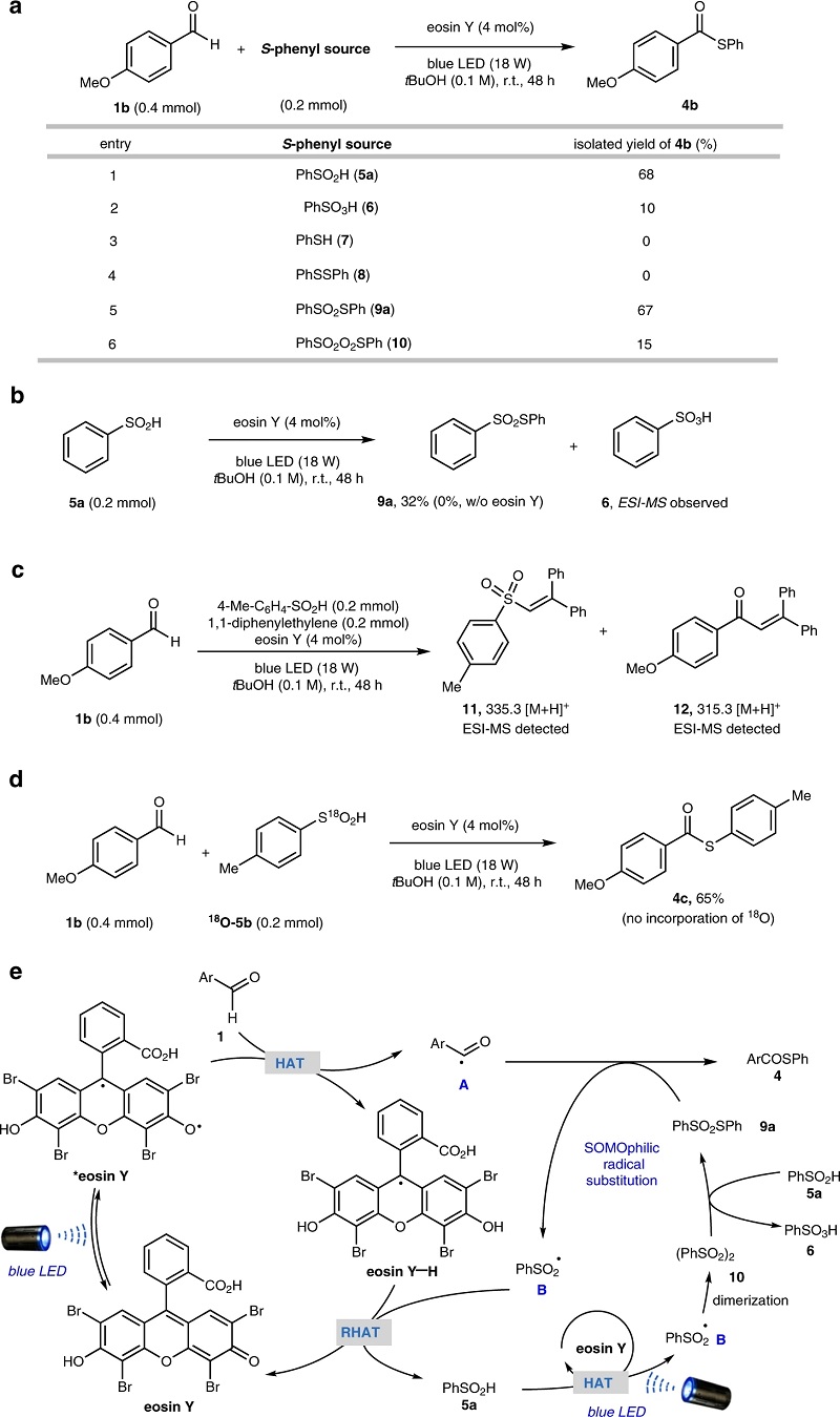 (b)曙红Y光催化从苯基亚磺酸5a形成S-苯基苯硫代磺酸盐9a;