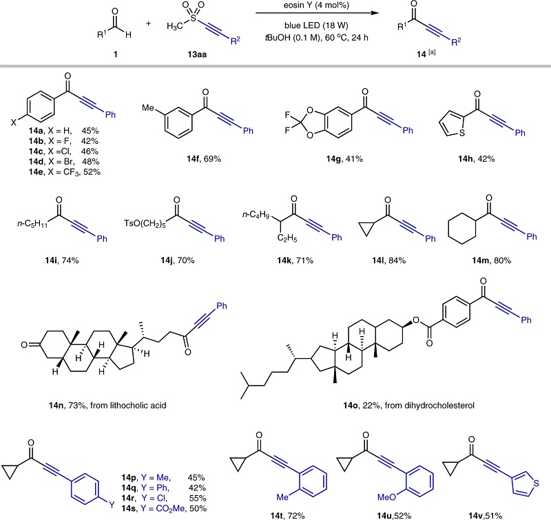 (b)使用砜试剂通过HAT光催化实现不同的醛基C-H功能化。