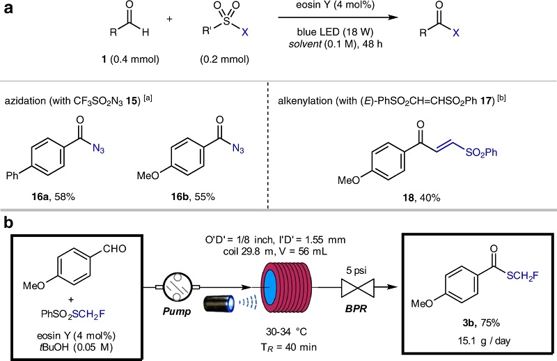 综上所述,作者通过将中性曙红Y-HAT光催化与各种砜基SOMOphiles合并以直接构建酰基-S、酰基-C和酰基-N键,展示了一个多功能的醛基C-H功能化平台。不同于现有的催化/化学计量系统,曙红Y-砜系统将作为一种更绿色和可持续的方法,更容易处理醛基功能化,并具有以下特点。(1)PhSO2-SCHxFy 2被证明对于与多种醛进行无金属、无添加剂和无氧化剂的氟甲基硫醇化反应特别有效。氟甲硫基化反应在连续流动条件下进行,可以达到每天15 g的生产率。(2)芳基亚磺酸(ArSO2H)作为一种无味且易于获取的试剂,用于醛的芳基硫醇化。初步机理研究表明,原位生成的芳基硫代磺酸盐(ArSO2-SAr)物种参与了随后的自由基取代步骤。(3)酰基-C(sp)键是通过酰基自由基加成-磺酰基自由基消除与甲磺酰基炔烃成功形成的。(4)利用自由基加成消除的多功能性,该策略进一步扩展到醛基C-H叠氮化和烯基化。总之,作者实验室目前正在研究将C-H底物范围扩展到丰富的烷烃并将砜基SOMophilic试剂的化学空间扩展到新的反应模式。