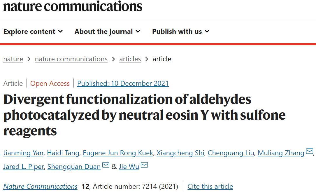 文献链接:Divergent functionalization of aldehydes photocatalyzed by neutral eosin Y with sulfone reagents. Nature Communications, 2021, DOI: 10.1038/s41467-021-27550-8.