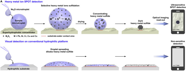 全世界有三分之一的人无法获得安全饮用水。值得注意的是,重金属离子(HMI)是威胁人类健康的主要水污染物,因为它们具有严重的毒性,甚至在微量水平上也是如此。因此,高效的HMI检测通过实现早期污染预警和有效的监管执行,对金属中毒起到了重要的防御作用。然而,以成本或时间效益高的方式,在现场超痕量水平上准确检测这些污染物仍然是一项艰巨的挑战。崔屹教授团队博士后Hsiang Kwee Lee领衔,发明重金属检测试纸,用手机拍照,直接得出水里的重金属浓度,具有便携、灵敏的特点。作者通过在超疏水表面硫化五种不同的HMI,将其同时量化到亚纳摩尔水平。硫化作为一种比色反应,而超疏水表面浓缩分析物以进行灵敏的视觉检测。超疏水浓缩器(SPOT)传感器可以通过与智能手机应用程序集成,在小于8分钟内对HMI进行量化,并且每次分析的成本为0.02美元。本产品使用现场设计分散水监测对于确保人人都能获得清洁水至关重要。该论文以题“Sensitive, portable heavy-metal-ion detection by the sulfidation method on a superhydrophobic concentrator (SPOT)”发表在One Earth上。