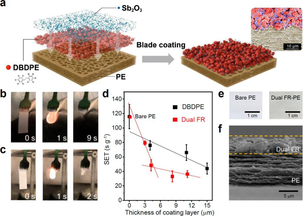 与锂离子电池相关的安全问题备受关注,尤其是随着对更高能量密度存储设备的需求不断增长。虽然添加到电解液中的阻燃剂(FRs)可以减少火灾危险,但需要大量的FRs,并且会严重恶化电池性能。崔屹教授团队博士后Lien-Yang Chou领衔,在电池隔膜上涂上固态灭火剂,拥有双功能,增加电池安全。通过在商用电池隔板上涂覆电解质不溶性FR来平衡阻燃性和电化学性能,双管齐下的机制整合双材料,通过控制超薄涂层(< 4 μm)达到几乎不影响电化学性能的目的。开发的复合分离器在全袋式电池中的阻燃性能是传统聚烯烃分离器的四倍。此外,该分离器可以方便地大规模制造,用于工业应用。组装高能量密度电池(2 Ah),以演示复合分离器的缩放情况,并通过钉子穿透实验确认其增强的安全性。该论文以题“Electrolyte-Resistant Dual Materials for the Synergistic Safety Enhancement of Lithium-Ion Batteries”发表在Nano Letters上。