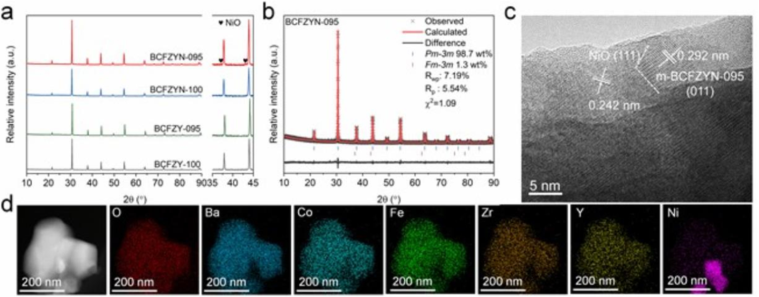 近日,南京工业大学的邵宗平教授、杨广明副教授(通讯作者)等人报告了一种在氧化气氛中纳米颗粒选择性溶出的纳米复合阴极用于PCFCs。通过对成分和阳离子非化学计量的控制,设计、合成并研究了Ba0.95(Co0.4Fe0.4Zr0.1Y0.1)0.95Ni0.05O3-δ(BCFZYN-095)前驱体,及其煅烧后形成的纳米复合材料,包括主要钙钛矿氧化物相和富集在钙钛矿氧化物表面的次要NiO相。钙钛矿氧化物相通过阳离子促进了质子传导,而NiO纳米颗粒则促进了氧气的表面交换过程,导致了卓越的性能,在650℃时最大峰值功率密度为1040 mW cm-2,在550℃时具有400小时的出色稳定性。相关成果以“A New Durable Surface Nanoparticles-Modified Perovskite Cathode for Protonic Ceramic Fuel Cells from Selective Cation Exsolution under Oxidizing Atmosphere”发表在Advanced Materials上。