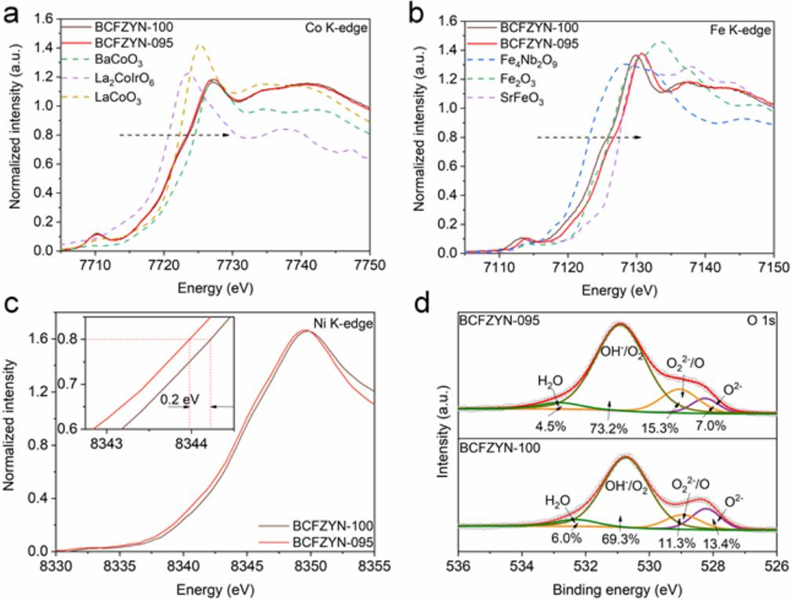 (c) BCFZYN-100和BCFZYN-095的Ni K-边XANES光谱;