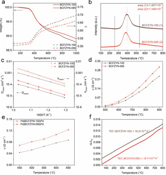 (a)在100-1000℃之间,BCFZYN-100和BCFZYN-095的TG曲线和氧的非化学计量比;