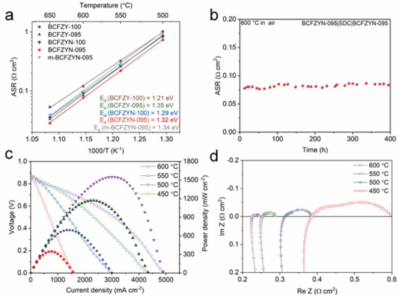 (a)在空气中,500-650℃范围内,BCFZY-100、BCFZY-095、BCFZYN-100、BCFZYN-095和m-BCFZYN-095电极的ASRs Arrhenius图;