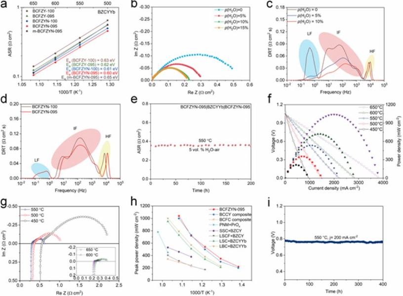 (e)在550°C的5% H2O-空气中,基于BZCYYb支撑的对称电池,BCFZYN-095电极的ASRs的时间依赖性。