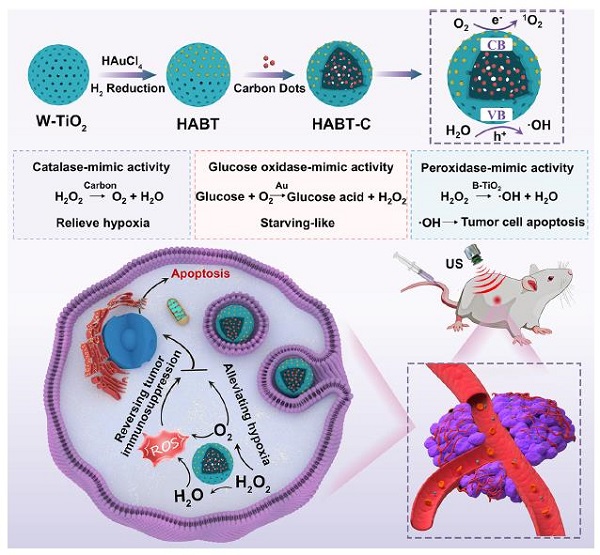 有鉴于此,中南大学的刘又年教授和邓留副教授等人设计发展了一种多功能平台(HABT-C@HA),首先将均一的空心白色二氧化钛作为前驱体由硼氢化钠进行还原得到黑色的二氧化钛,再在该材料表面先后合成和修饰金纳米颗粒、碳点和透明质酸。研究表明,HABT-C@HA具有内生性的多酶(葡萄糖氧化酶、过氧化氢酶和过氧化物酶)仿生活性,可作为自级联纳米酶循环产生氧气和活性氧ROS用于声动力学治疗以实现逆转肿瘤免疫抑制微环境和缓解肿瘤微环境中的缺氧,为实现高效抗癌提供了新的思路。本文第一作者为博士研究生陶娜,研究成果以题为“A Cascade Nanozyme with Amplified Sonodynamic Therapeutic Effects through Comodulation of Hypoxia and Immunosuppression against Cancer”发布在国际著名期刊ACS Nano上。