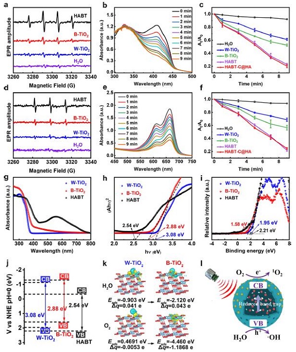 (a,d)EPR图谱阐释了不同组分钛基材料在超声辐照下的羟基自由基(a)和单线态氧(d)的产生;