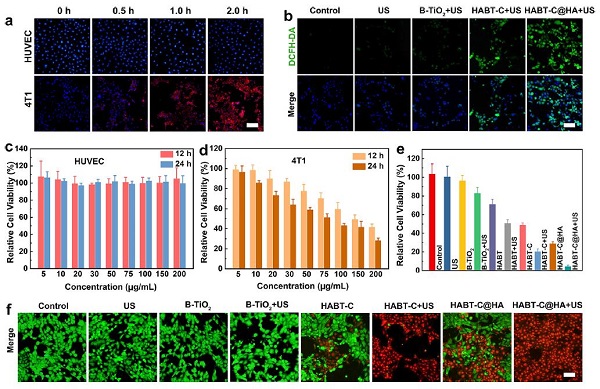 (c,d)与不同浓度HABT-C孵育后4T1细胞和HUVECs细胞的相对活性;