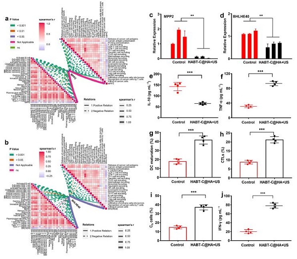 该工作成功地构建了一种多功能纳米酶平台,具有级联酶活性和高效的声动力学效应用以共调节肿瘤微环境中的缺氧和免疫抑制因素。这个肿瘤治疗系统具有如下优势:首先,该系统可作为级联平台实现连续的氧气输出和丰富的高效ROS产出;其次,理论计算和实验结果均表明HABT-C@HA的电子陷阱位点可以实现电子-空穴分离和水/氧气吸附,从而提高响应自由基的催化产生效率;随后,系统的级联酶性质、放大的声动力学活性、靶向性等可有效精准地清除肿瘤。最后,RNA-sq结果揭示了HABT-C@HA可激活免疫响应,下调诸如MPP2和BHLHE40等负相关因子,从而提高免疫浸润、逆转肿瘤免疫抑制。HABT-C@HA可以为治疗剂应用提供新的策略,也为增强肿瘤催化治疗和肿瘤免疫性提供工具。
