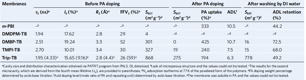 本工作制备了4种高分子量TB基聚合物(即DMDPM-TB、DMBP-TB、TMPI-TB和Trip-TB。设计了4种聚合物,通过空间位阻、旋转柔性和聚合物链的堆积效率的差异来引起本征微孔尺寸和分布的变化。采用正电子湮没寿命谱(PALS)表征微孔率,它基于对位于材料自由体积中的γ射线产生的正电子的寿命测量。通过 PATFIT和CONTIN程序分析了四个TB薄膜的峰值归一化PALS光谱,覆盖了从大约1000到2400的宽通道数(图 1b)。本工作也对PA掺杂后TB基聚合物的微孔结构感到好奇。然而,由于PA对22Na源的污染,PALS技术不能用于PA掺杂膜的分析。因此,本工作采用77 K采集的N2吸附/解吸等温线的表观Brunauer-Emmett-Teller (BET)表面积(SBET)表征PA掺杂前后的微观孔隙。但值得注意的是,气体吸附测量并不能完全阐明负责分子筛分的临界超微孔尺寸分布。DMDPM-TB在4种TB基聚合物中具有最多的聚合物链柔性,可溶于85%的PA中,使其在PA掺杂后的BET测量无法进行,膜不适合PA掺杂的PEM应用。对于DMBP-TB和TMPI-TB膜,PA掺杂后SBET值下降到几乎0,说明微孔中填充了PA。更有意思的是,Trip-TB显示SBET表面积从868 m2g-1减小到275 m2g-1,表明32%的微孔体积未被占据。这与PALS分析非常吻合,因为较小孔隙率(R3=2.8 Å,FFV3)的FFV是Trip-TB总FFV的31%(表1)。这可能表明PA可以更容易地占据较大的孔R4(4.4 Å),但由于骨架刚性而不太能够占据较小的孔R3 (2.8 Å)。