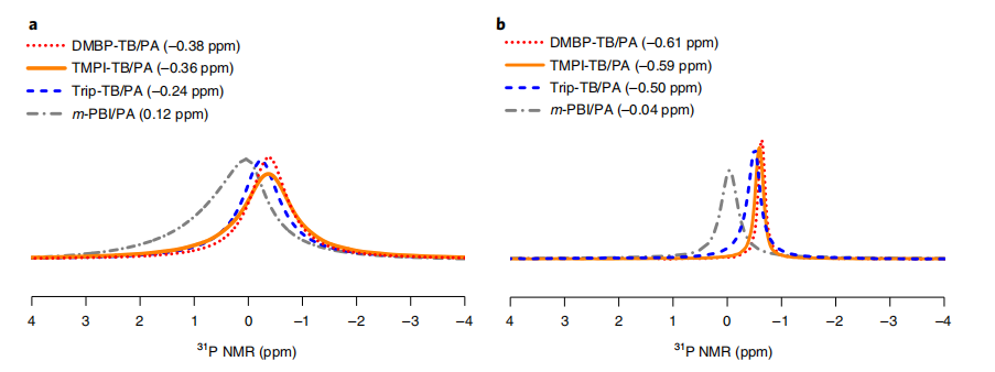 用85 wt% PA (图2a)或纯PA (图2b)处理膜,用31P核磁共振进行分析,证实了膜的虹吸效应,并说明了水的影响。在这两种情况下,没有本征微孔的m-PBI/PA均在0 ppm附近出现了宽信号,表明无体相PA的存在。所有TB基膜都表现出更多的31P核磁共振上场化学位移,DMBP-TB/PA膜上场化学位移最大。与游离PA相比,更多的上场化学位移可能是这些聚合物中离域芳香环电子系统的环电流屏蔽效应的结果。孔径依赖的31P核磁共振化学位移趋势与最近报道的PA在多孔电催化剂中分布一致,进一步证实了PA分子在超微孔中的位置。对比图2a、b,缺水使得31P核磁共振化学位移上移更多,这与氢键模型相反,其中水与PA的氢键作用导致31P核磁共振上移。尽管m-PBI/PA具有最高的吸水量,但它显示出最大的低场化学位移。因此,可以合理地得出结论,超微孔屏蔽的影响比氢键对31P NMR化学位移的影响更深远。DMBP-TB膜中微孔壁与PA之间的平均距离减小表明与PA的空间相互作用最强。