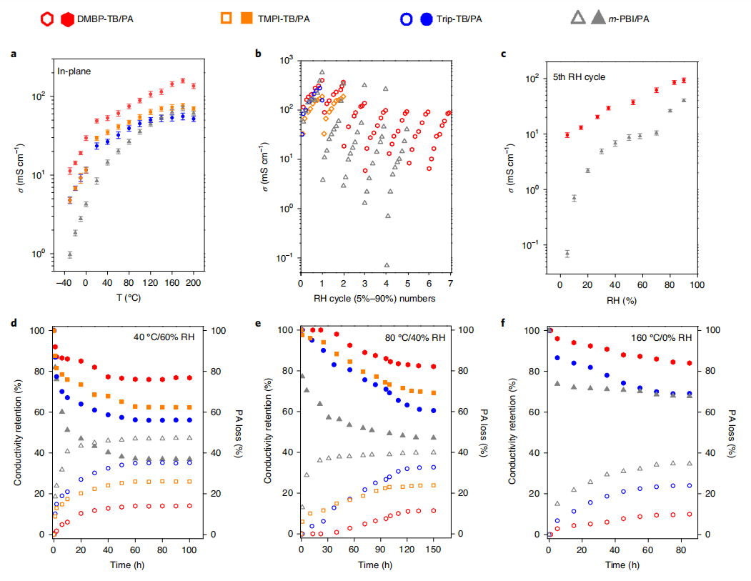 在-30°C~180°C的温度范围内,在不加湿的条件下,测量了PA掺杂膜的质子传导率(图3a)。DMBP-TB的电导率最高,这是由于其对PA的吸收率最高,而TMPI-TB/PA和Trip-TB/PA膜的质子电导率也高于m-PBI/PA,尽管它们的PA吸收率和ADL都较低。这表明TB基膜中固有的微孔结构可能有利于质子的传输。在180°C时,DMBP-TB膜的质子传导率最高,达到159 mS cm-1。更重要的是,本工作观察到TB基PEMs的低温质子电导率(从-30℃到0℃)优越,这些性质与低温燃料电池和冷启动密切相关。本工作认为,占据本征微孔的PA在较低温度下具有较高的质子电导率。对于DMBP-TB/PA膜,在-30℃时,该现象明显,表现出比m-PBI/PA (小于1 mS cm-1)高一个数量级的质子电导率(10 mS cm-1) (图3a),而且透过面电导率也有类似的变化趋势,这为实际燃料电池中膜性能的估算提供了更合适的依据。在较低温度和较高RH条件下(40℃/60% RH),m-PBI/PA膜的PA损失变得更加严重。m-PBI/PA的质子电导率和PA含量在100h评价期后均下降50%以上,DMBP-TB下降不到20%,TMPI-TB/PA和Trip-TB/PA膜下降了35~45%(图3d)。与QAPOH21相当的DMBP-TB/PA性能显著提高,进一步验证了具有适当微孔尺寸(R3)的亚纳米孔TB/PA超微孔膜可以减少PA的损失,并可在全温度范围内操作,提高耐水性。