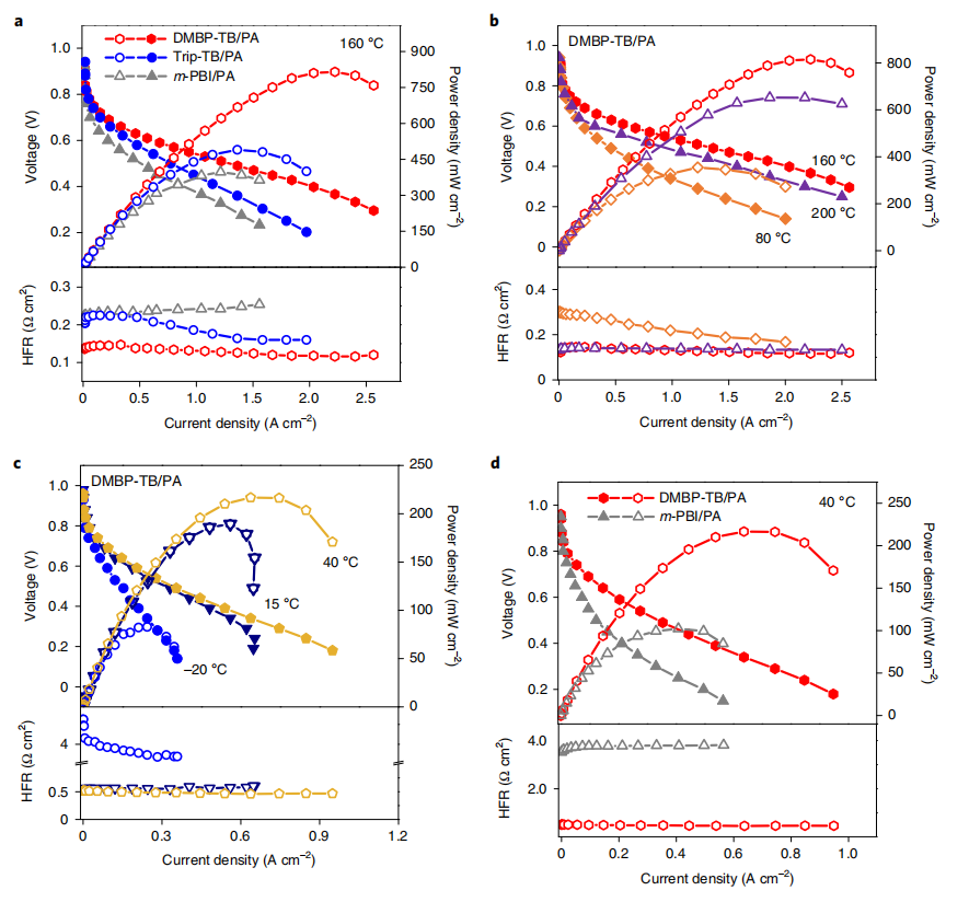 以碳载Pt催化剂和聚四氟乙烯(PTFE)乳液为粘结剂,制备了PA掺杂TB和m-PBI/PA膜的膜电极组件(MEAs)。本工作首先在160 ℃下对不同的膜进行评价,没有外加湿化或背压,这是评价PA掺杂膜的典型条件。如图4a所示,尽管反应动力学区域的O2还原反应(ORR)活性仍然较低,但可能是由于磷酸根吸附和/或非质子导电PTFE粘结剂的使用导致Pt催化剂损伤所致,DMBP-TB/PA基MEA获得了最佳的燃料电池性能,在160°C时的峰值功率密度为815 mW cm-2,是m-PBI/PA膜(397mW cm-2)制备的MEA的两倍多。Trip-TB/PA MEA也观察到了类似的行为,尽管其PA吸收率较低,但其燃料电池性能优于m-PBI/PA。m-PBI/PA MEA表现出最低的性能,这是由于其最高的电池高频电阻(HFR),在测试期间从 224 mΩcm2增加到 254 mΩcm2(图4a)。这些 MEA 的峰值功率密度趋势与其膜质子电导率一致。