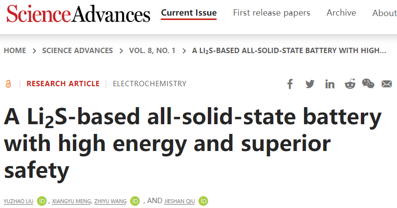 来自大连理工大学的王治宇教授和北京化工大学的邱介山教授团队提出了一种安全的固态化学电池,用以满足高能量和电池可靠性。利用Li2S正极和Si负极之间高能而稳定的多电子氧化还原反应,在具有快速离子传输的坚固固体聚合物电解质中设计了全固态充电电池。这种电池可在500次循环中提供500至800Wh kg−1的质量比能量,并且具有快速的速率响应、可忽略的自放电效应和良好的温度适应性。本文将本质安全的电池化学与坚固耐用的电池设计相结合,进一步保证了可逆的能量存储不会在空气和水中极端滥用过热、过充电、短路和机械损伤。这项工作可能会为弥合高能和安全之间的巨大差距提供新的见解,以便可行地应用和回收。相关工作以题为“A Li2S-based all-solid-state battery with high energy and superior safety”的研究性文章在《Science Advances》上发表。