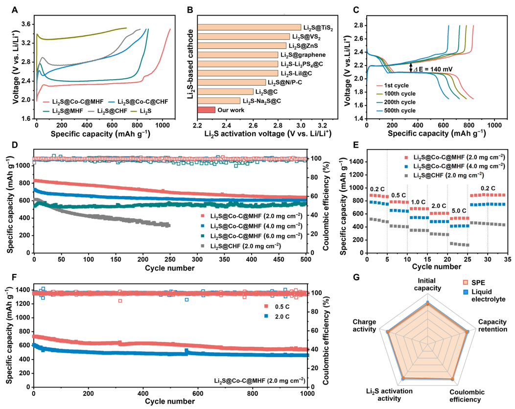 本文首次在LES中评价了Li2S@Co-C@MHF负极相对于锂金属正极的本征性能。所有电压指的是半电池中的Li/Li+。在初始充电时,需要2.32 V的低电压才能激活固态Li2S,然后LiPS通过2.33至2.34 V左右的长而平坦的平台转化为硫(图3A)。这样的活化势垒远低于大多数报道的纳米结构Li2S负极的块状Li2S(3.4 V),接近Li2S的热力学氧化电位(约2.3 V)(图3A和B)。本文发现,其初始库仑效率(CE)约为83%。在初始激活后,通过充电到2.8 V,它保持了835 mAh g−1的高容量,激活过电位可以忽略不计(图3C)。