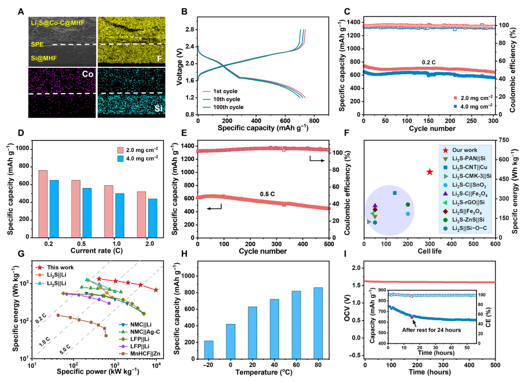 本文报告了在SPE中Li2S负极和Si正极之间的高能而温和的多电子氧化还原化学,在全固态电池中实现了高电池能量和安全性(图1)。为了提高Li2S负极的氧化还原活性,同时强化固相萃取中的Si正极,本文设计了一种多层纳米反应器电极,与液体或准固态电极相比,该电极对电极的活性和稳定性有更严格的要求。同时,锂离子在电极上的可及性和电池的可逆性通过原位形成具有快速离子传输和紧密界面接触的唇部不透性固相萃取物而最大限度地提高了电极的可获得性和电池的可逆性。稳定和充满活力的固态电池化学不仅确保高能量,电池寿命长,自放电可以忽略不计,而且在空气和水中防止极端的热、电和机械冲击情况的可逆能量存储。