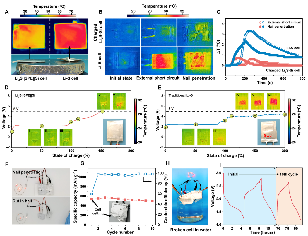 加热到100°C后,Li2S||SPE||Si电池可以继续为LED供电,而不会发生电池变形(图5A)。而过热的锂硫电池具有相似的电极负载,通过电解质蒸发和分解及其与锂金属正极的强烈副反应而导致大而快速的膨胀(图5A)。在加热过程中,Li2S||SPE||Si电池表现出很高的耐热性,温度比Li-S电池低15到20 ℃。这种电池抗电气滥用的高可靠性体现在外部短路时从充满电的Li2S||SPE||Si电池产生的微不足道的热失控(图5B中间)。钉子穿透带电的Li2S||SPE||Si电池只会导致穿刺点附近的温度略有上升(图5B右)。这与Li-S电池相反,在外部短路或钉子穿透后,Li-S电池的温度上升了3到5倍(图5C)。