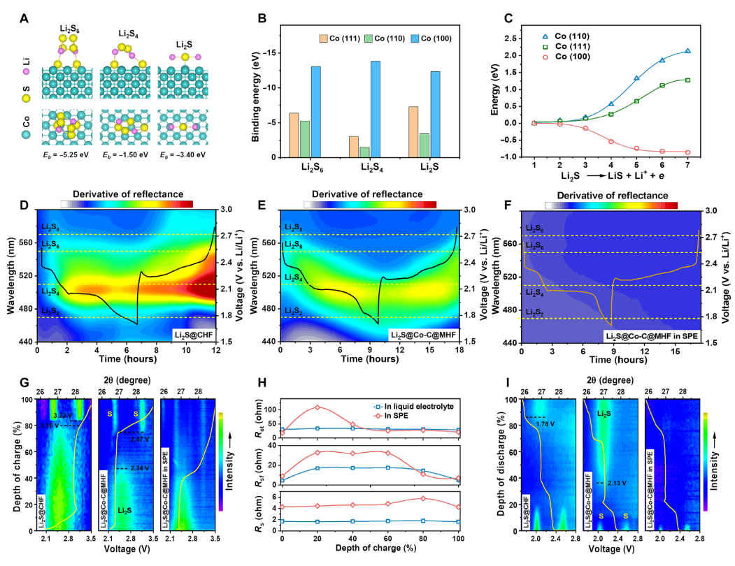 以含沸石咪唑骨架-67(ZIF-67)的聚甲基丙烯酸甲酯(PMMA)为芯液,以分散在聚丙烯腈(PAN)中的Ti3C2Tx Mxene为鞘液,采用同轴静电纺丝法制备了聚合物织物。在纺丝过程中,粘性PAN流体的剪切力将MXene组装成壳层厚度为20至40 nm的中空纳米纤维(MHF)(图2A)。通过在H2/Ar流中对聚合物织物进行退火,芯纤维在紧密堆积的MXene壳层(表示为Co-C@MHF)中转化为Co纳米颗粒修饰的碳纳米笼(Co-C)(图2B)。它创造了一个多级纳米反应器(Co-C@MHF),可以在不限制LiPS转化动力学的情况下捕获LiPS (图2B和C)。