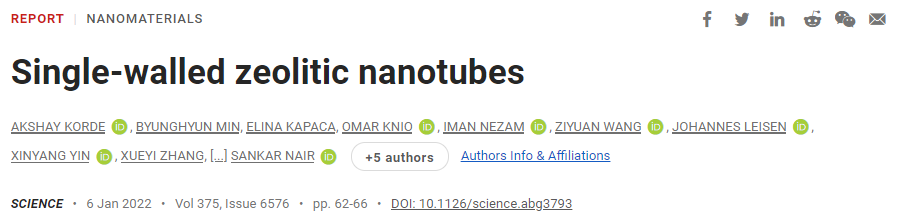 美国佐治亚理工学院Christopher W. Jones、Sankar Nair和瑞典斯德哥尔摩大学Tom Willhammar课题组合作,报道了具有微孔沸石壁的单壁纳米管的准一维沸石合成和结构。这种准一维沸石是由含有中心联苯基团的偶极型结构导向剂(SDA)组装而成的,该联苯基团由C10烷基链连接到喹啉端基上。高分辨率电子显微镜和衍射等揭示了一种独特的壁结构,它是由β和MFI两种沸石结构的特征建筑层混合而成。这种杂化结构产生于弯曲纳米管管壁形成过程中应变能的最小化。纳米管的形成涉及到由于SDA分子的自组装而导致的一种细观结构的早期出现。SDA分子的联苯核心基团显示出π堆积作用,而外围的喹啉基团则直接形成微孔壁结构。相关论文以题为“Single-walled zeolitic nanotubes”发表在Science上。