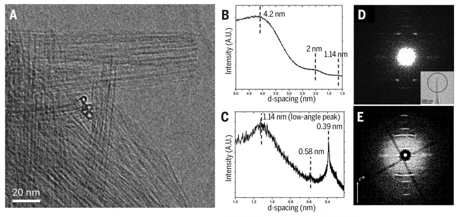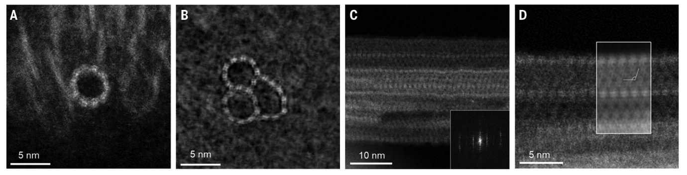 图2 B和C显示了煅烧纳米管的低角度和广角粉末X射线衍射(PXRD)图谱。如前所述,伊毛缟石纳米管的低角度PXRD图谱主要由单个纳米管和小管束的散射形式因子决定,主峰位置与单个纳米管的外径近似对应。此峰(图2B中~4.2nm)代表纳米管直径,其后峰(2和1. 1)为高阶散射峰。宽角PXRD谱图中的峰(0.58和0.39 nm)显示了纳米管管壁的周期性(图2C)。薄的(~1 nm)纳米管管壁弯曲成封闭的圆柱体而不是扩展的3D晶体或2D薄片,导致宽的PXRD峰不适合结构测定。大多数多晶3D周期沸石的晶体结构,无论是从3D电子衍射还是PXRD都已确定。对于缺乏三维周期性的材料,如二维沸石,高分辨率的TEM成像是结构解释的关键。这些技术在目前的背景下特别具有挑战性,因为沸石被还原为具有非常薄(~1 nm)壁的空心圆柱1D形式。