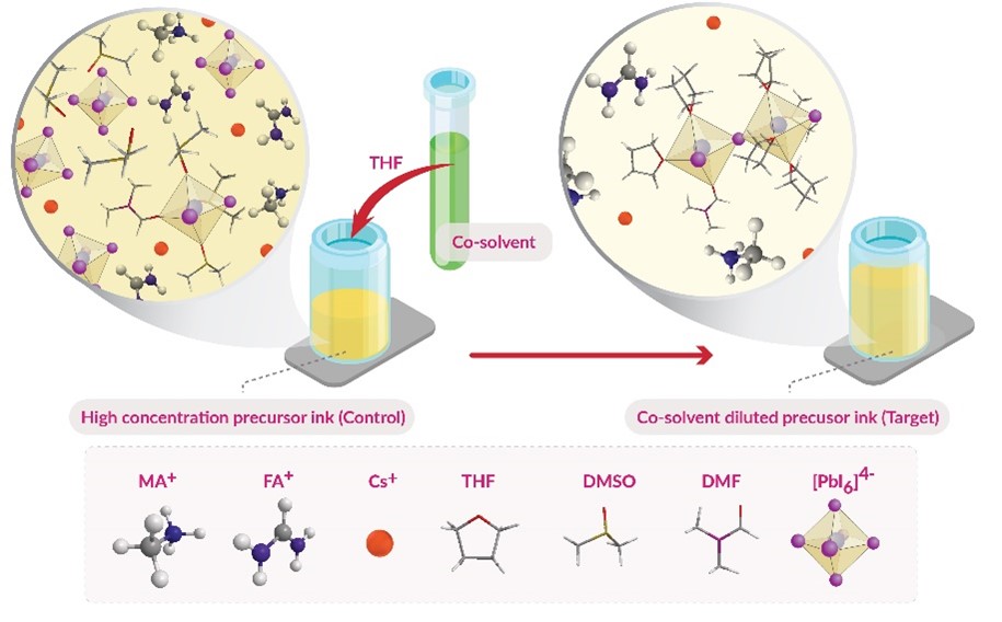 通常,钙钛矿薄膜的厚度与前体溶液浓度之间的直接关系意味着制造高效PSCs 需要相对高浓度 (>1.4 M) 的含铅前驱体,以获得高质量的钙钛矿薄膜用于光伏器件。这种具有高粘度和低蒸发速率的高浓度钙钛矿溶液对工业应用中典型的可扩展钙钛矿沉积方法造成了障碍,例如缝模涂布、喷涂、刮刀涂布、喷墨印刷、卷对卷印刷以及作为基于工业的旋涂,通过减慢连续生产速度并减少收集和重复使用过量溶液的机会。高浓度溶液的另一个缺点是它们的保质期短,因为它们容易聚集和结晶,这会增加有毒废物。因此,迫切需要开发一种环保策略,通过同时减少加工步骤中的有毒废物和延长钙钛矿油墨的保质期,最大限度地减少有毒材料的消耗,实现钙钛矿电池的绿色低成本制造。