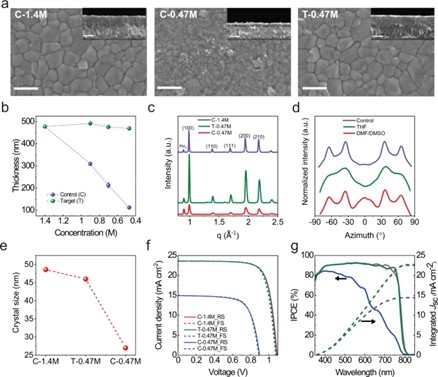 (a) 具有不同前驱体浓度的对照和目标三阳离子钙钛矿薄膜的 SEM 图像。插图显示横截面 SEM 图像。比例尺为 500 nm。 (b) 钙钛矿前驱体浓度与薄膜厚度之间的关系(所有薄膜均使用相同的涂层条件制备;通过轮廓仪测量膜厚度)。(c) GIWAXS 散射强度与 q 的关系。 (d) 环的方位角积分强度在 1A˚-1 的 q 范围内分配给 (100) 衍射。 (e) 钙钛矿相晶体尺寸(2θ=14∘)与前驱体组成的变化。基于不同的前体溶液的三阳离子钙钛矿电池的 J-V 曲线 (f) 和 IPCE 光谱 (g)。