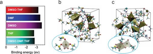 (a) Pb2+ 离子与溶剂及其混合物的平均结合能。从头算 MD 模拟 (b ) DMSO 和 (c) THF/DMSO 混合物中钙钛矿前体在 ~15 ps 后。所有物种都用球和棍子表示。 Pb 离子为金色,I 为粉红色,Cs 为蓝绿色,Br 为橙色,C 为浅蓝色,N 为深蓝色,O 为红色,S 为黄色,H 原子为白色。在 (b) 和 (c) 图中,铅配位多面体显示在 3.6 Å 截止范围内。