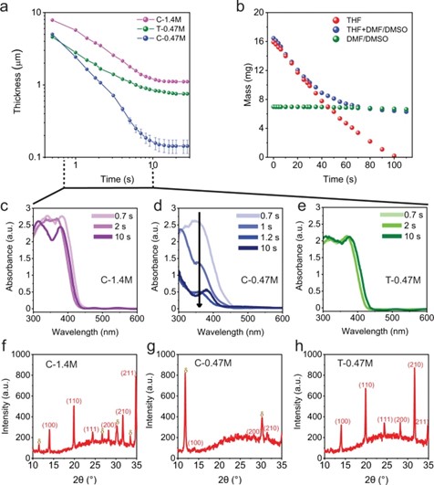 (a) 钙钛矿前驱体溶液旋涂过程中的动态减薄行为。 (b) THF、DMF/DMSO 以及这两者的混合物的溶剂蒸发速率。 (c-e)旋涂过程中UV-vis光谱随时间演化。 (f-h)旋涂完的钙钛矿中间态薄膜上的 XRD谱图对比。