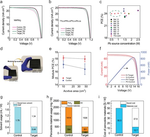 基于 (a) MAPbI3 和 (b) FA0.97MA0.03PbI2.91Br0.09 钙钛矿电池 的 J-V 曲线; (c)文献中基于不同前驱体溶液浓度的器件性能和本工作的对比;(d) 通过共溶剂稀释策略制造小型和大型钙钛矿模组照片; (e)不同尺寸模块性能的重现性统计; (f)最佳大面积(100 cm2)钙钛矿模组的 I-V 曲线; (g-i) 使用和不使用共溶剂稀释的模块制造的成本和废物产生分析。 PbX2 = PbI2 + PbBr2; AX = FAI + MABr。材料成本包括使用的所有溶剂和钙钛矿材料的成本。