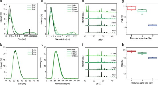 新鲜前体溶液的 动态光散射(DLS) 数据 (a) 没有和 (b) 有共溶剂稀释。数据是在不同的扫描中收集的(每次扫描需要 3 分钟)。 (c-f) DLS 数据和老化前体溶液 (c, e) 没有和 (d, f) 共溶剂稀释的 XRD数据。 基于没有(g)和有(h)共溶剂稀释的钙钛矿前驱体老化过程中的器件性能对比(用于器件制造的钙钛矿薄膜无需任何表面钝化处理)。