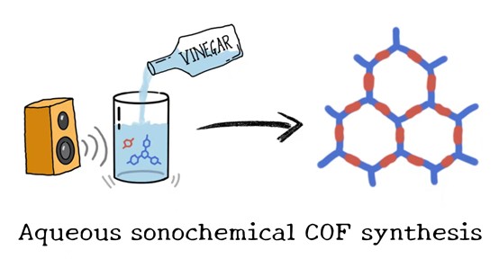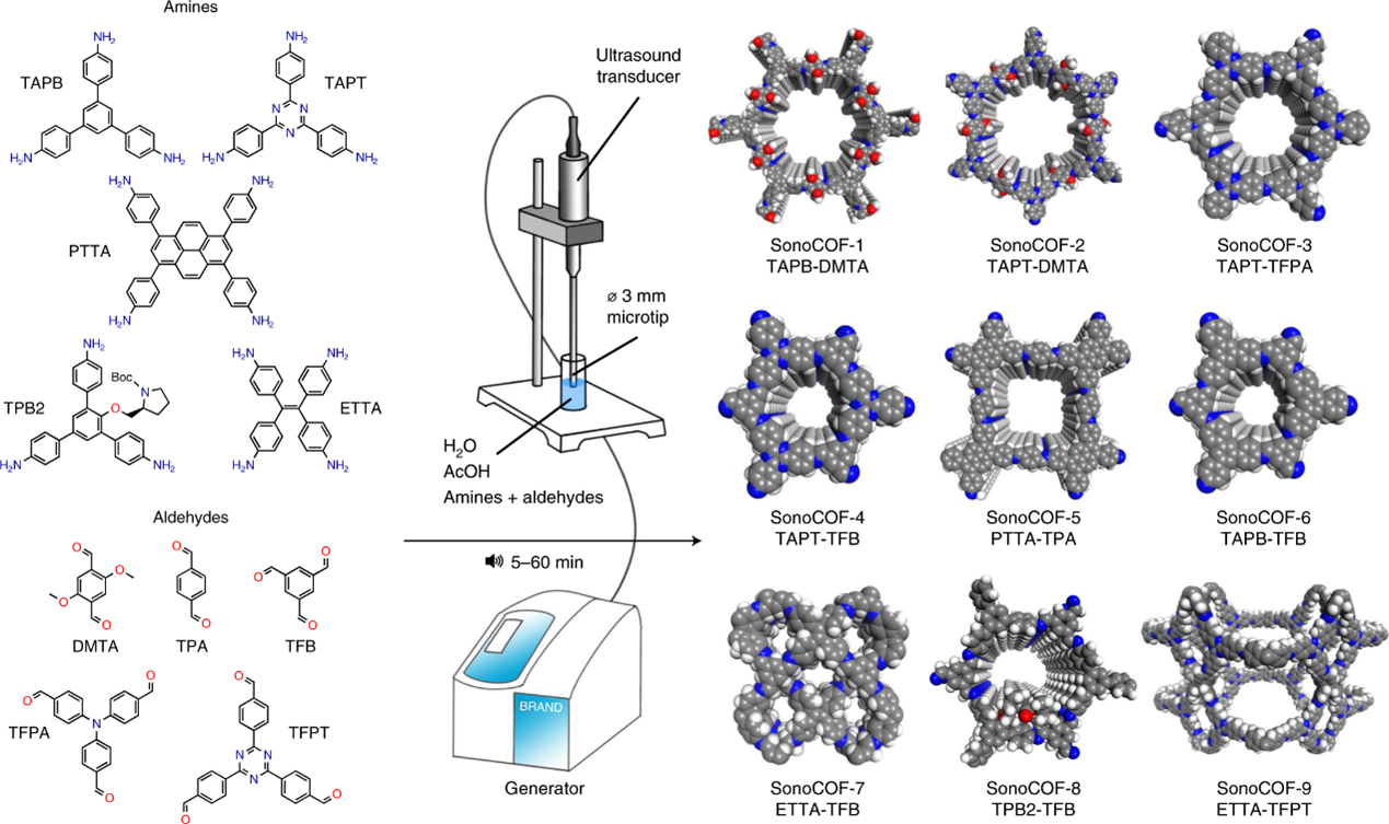 为了应对以上挑战,推动COF领域的发展,利物浦大学Andy Cooper 团队发展了一种在水相体系中采用超声制备COFs材料的新策略。相比于传统方法,超声合成:1)操作简单,将反应原料与乙酸水溶液混合后在室温空气中即可合成;2)大大缩短合成时间,通常1个小时即可获得高结晶性材料;3)合成过程更加绿色,反应不需要有机溶剂参与,在水相中即可进行;4)可大量制备,1小时即可获得克级材料。此外该方法具有较好的普适性,作者借助该策略成功制备了9例材料(图1),其中包括两例首次报道的COF材料。