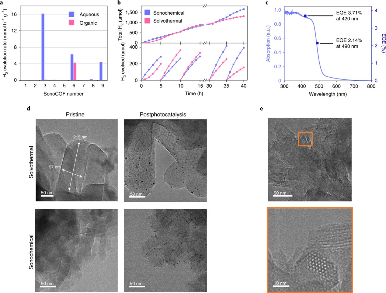 有趣的是,作者发现这种快速合成的COFs材料表现出更加优异的多孔性和结晶性。作者进一步对比了通过超声合成的COF(sonoCOF-3)和溶剂热法制备的材料(solvoCOF-3)在光分解水产氢性方面的性能,结果sonoCOF-3展现出了更加优异和稳定的产氢性能(图2b)。