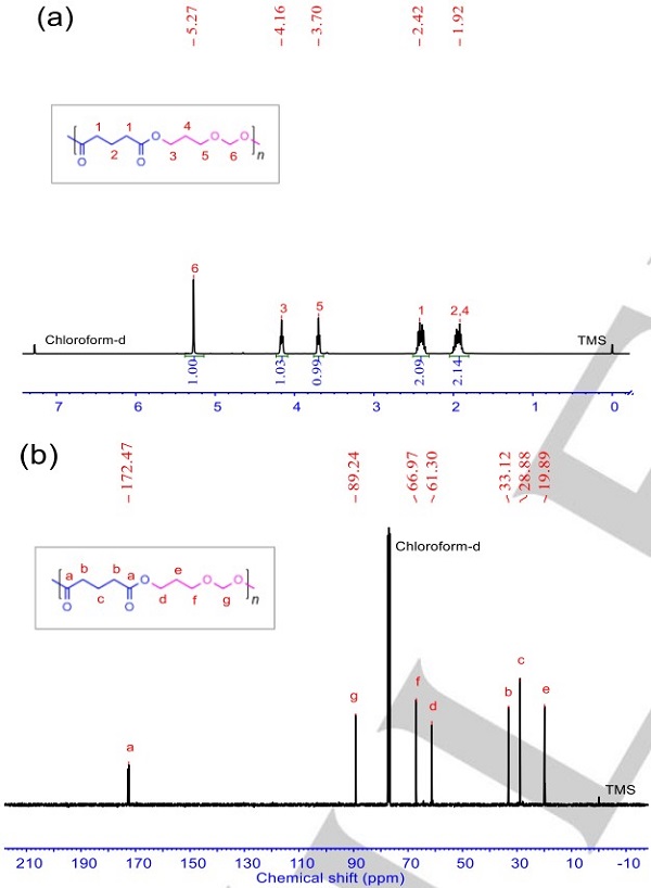 1,3-二恶烷和戊二酸酐反应聚酯的核磁氢谱和碳谱(BF3•Et2O,25 ℃,30分钟)