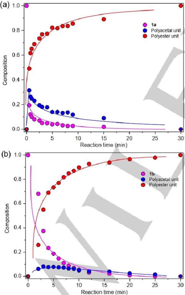 在1a/2a和1b/2a共聚反应中,随着反应时间变化时组分的改变