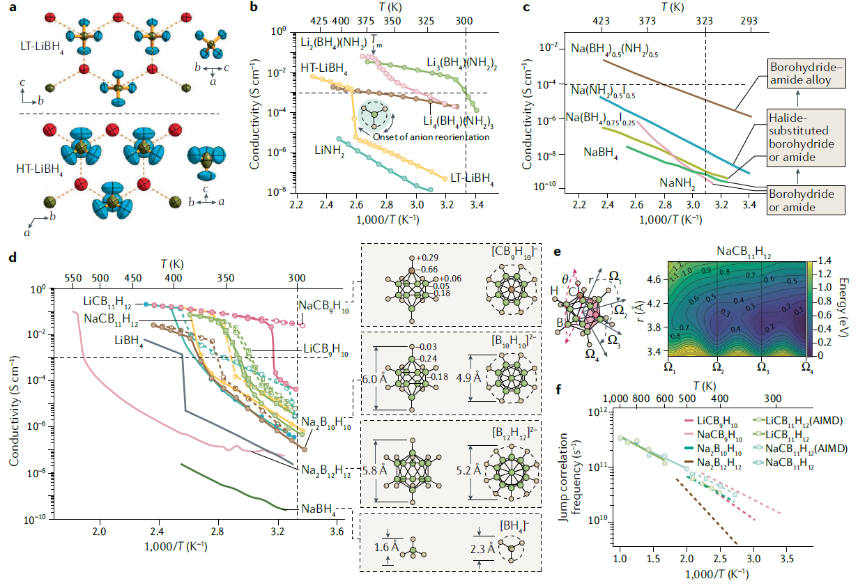 图4. [BH4]–和[BnHn]2-聚阴离子在无机碱金属离子导体中的旋转。(a) LiBH4结构中的六元Li-BH4环(左)和BH4晶胞(右),椭圆体概率为40%;(b) Li2(BH4)(NH2)、Li3(BH4)(NH2)2和Li4(BH4)(NH2)3以及主体材料的电导率与温度的关系;(c) NaBH4、Na(BH4)0.75I0.25、Na(NH2)0.5I0.5和Na(BH4)0.5(NH2)0.5的电导率与温度的关系;(d) 钠、锂闭合型硼酸盐和碳代闭合型硼酸盐的电导率与温度的关系;(e) 基于从头算分子动力学(AIMD) 计算的Na+和[CB11H12]–之间的局部相互作用;(f) LiCB11H12和NaCB11H12的无序相的阴离子跳跃与温度的关系。