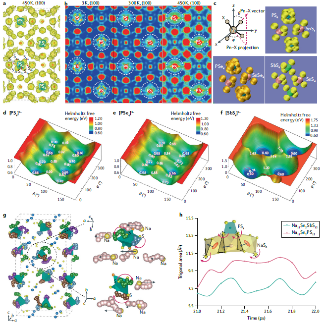 (a,b) 变温中子粉末衍射的Na11Sn2PS12的核密度图;(c) 由从头算分子动力学(AIMD)模拟得到的Na11Sn2PS12、Na11Sn2PSe12和Na11Sn2SbS12的[PnX4]3-聚阴离子的三维概率密度分布;(d-f) Na11Sn2PS12、Na11Sn2PSe12和Na11Sn2SbS12的亥姆霍兹自由能表面;(g,h) AIMD模拟分析证明[PS4]3-/[PSe4]3-阴离子旋转与Na+输运存在耦合。