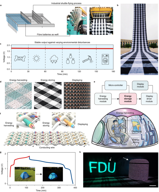 溶液纺丝法连续化制备的纤维电池可直接通过商用纺织机(图3a)编织为大面积(10m2)的储能织物(图3b)。得益于所采用的水系凝胶电解质,所制备的储能织物具有较高的安全性,可耐受高温、刺穿而避免安全隐患(图3c)。类似地,织物电池在常见的使用场景中,如浸泡、载重、洗涤及撞击等,都能保持较高的电化学稳定性。将可规模化制备的纤维电池作为储能平台,可与一系列具有其他功能的纤维电子器件如纤维太阳能电池、发光纤维等集成,在柔性织物结构中同时实现能量收集、储存和对电子器件的供能 (图3d-f)。作为概念的证明,研究团队制作了一个帐篷,其中外层由太阳能电池织物组成,内层由储能织物组成(图3f,g)。该帐篷可以在白天通过外层太阳能电池收集太阳能,储存在帐篷内层电池织物中,随时为帐篷内的用电器如柔性显示器供电 (图3g)。