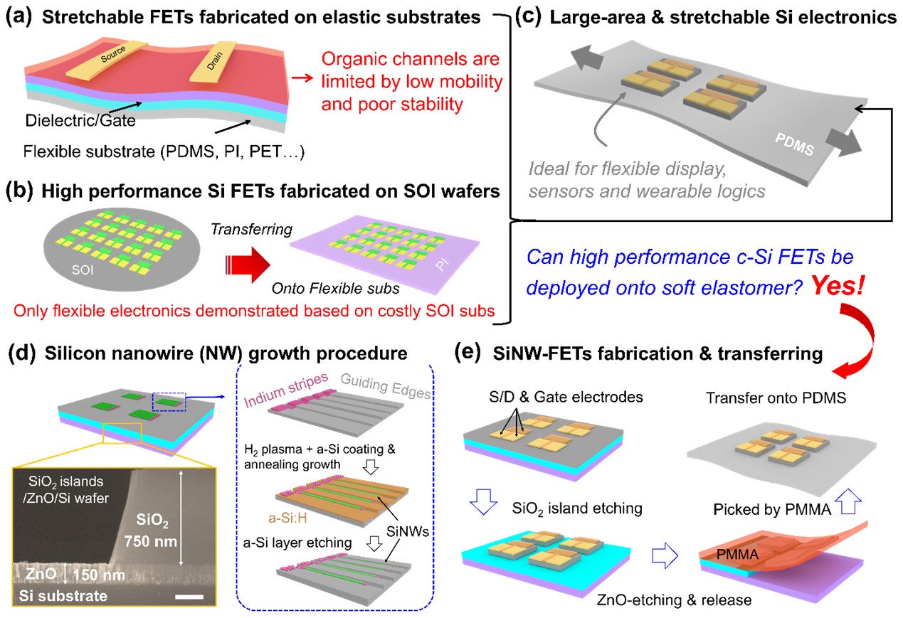 在大面积超柔性聚合物衬底上规模集成高性能硅基电子器件是实现新一代可拉伸柔性电子皮肤逻辑、传感和显示应用的关键技术难点。尽管柔性有机薄膜已被广泛用于可拉伸FET器件,但其相对较低的载流子迁移率和较差的器件稳定性限制了其规模化器件应用。此外,无机一维纳米线沟道材料具有高迁移率、低成本等优势,可用于开发各种高性能、低功耗柔性电子逻辑和超灵敏的场效应探测器件,但往往难以精确可控地实现规模集成应用。迄今为止,除了将SOI衬底上制备的晶硅逻辑规模转移到柔性PI衬底上外,还没有在高弹性PDMS衬底上实现大面积电子兼容的高性能可拉伸柔性晶硅电子器件制备和验证。