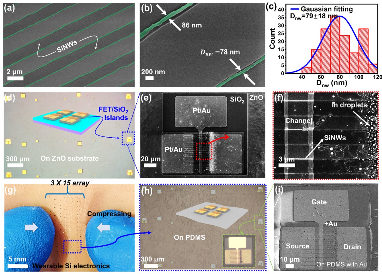 图2:台阶引导SiNWs的形貌表征及直接统计分布;晶圆衬底、人体皮肤及PDMS衬底上的SiNW-FET/硬岛器件结构