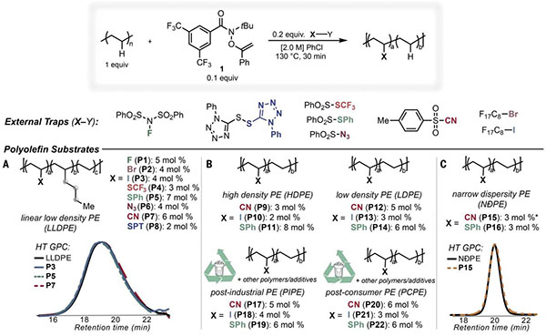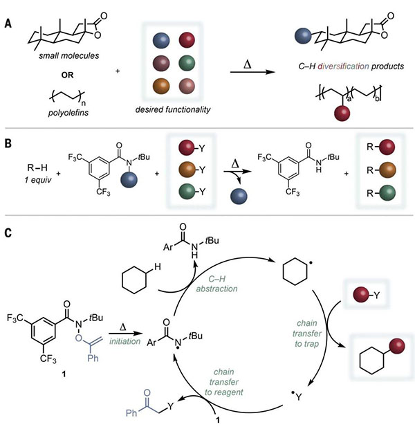选择性地将不同官能团引入C-H化合物的能力在小分子和聚合物的合成中具有重要价值,可以从现成的化合物中获取具有增强特性的复杂分子和材料。尽管取得了实质性进展,但仍然迫切需要脂肪族C-H多样化。据估计,塑料在一次使用后会损失95%的经济价值。具体来说,支链聚烯烃占全球生产聚合物的 35%以上,但在机械再加工或聚合物功能化过程中会发生有害的断链,这会降低其热机械性能并导致其回收率低。开发合成方法以在使用后的支化聚烯烃上添加所需的官能团将使得从混合塑料废料中获取性能优越的热塑性塑料。目前,存在许多脂肪族C-H键的转变,并用于药物样分子和商品聚合物的后期多样化,但其中大多数使用导向基团来控制反应位点选择性或涉及混杂的反应中间体,这限制了方法选择的范围。无论采用何种方法,几种有价值的C-H转化,例如脂肪族C-H碘化和C-H甲基化,都仍然受到限制。最近的研究表明,杂原子中心自由基可促进各种小分子和材料上未活化的脂肪族C-H键的位点选择性、分子间功能化,构成金属催化方法的补充策略。这些反应主要利用调谐的、以氮为中心的自由基的能力,以实现从强的、未活化的脂肪族C-H位点轻松转移氢原子(HAT)。这些先前研究的一个关键缺点是需要直接基团转移附加在氮上的功能,这极大地限制了可通过HAT得到产品多样性的可能性。