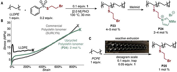 今日,美国北卡罗来纳大学教堂山分校Erik J. Alexanian教授和Frank A. Leibfarth教授(共同通讯作者)报告了一种使用自由基链转移来实现脂肪族碳氢键多样化的方法,该方法使用具有易于制备的O-alkenylhydroxamate试剂,在温和加热后可促进小分子和聚烯烃的一系列具有挑战性或以前未开发的脂肪族碳-氢键功能化。实际上,可以在不立即捕获碳的情况下去除氢,试剂的加热或光解产生一对自由基,其中一个迅速裂解C-H键,而另一个保持相对惰性。然后,各种各样的其他自由基源可以介入形成碳-卤素、碳-碳和碳-硫键。将咪唑鎓基团添加到聚乙烯泡沫中的两步升级循环序列产生了潜在有价值的离聚物。这种广泛的反应平台使用于处理塑料废物的基础设施中消费后的聚烯烃功能化。此外,使用碳氢键功能化将离子官能团化学选择性地放置到支化聚烯烃上,将材料从热塑性塑料升级为具有高价值聚烯烃离聚物拉伸性能的坚韧弹性体。相关研究成果以“Diversification of aliphatic C-H bonds in small molecules and polyolefins through radical chain transfer”为题发表在Science上。