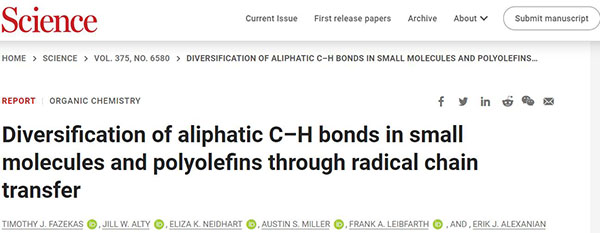 文献链接:“Diversification of aliphatic C-H bonds in small molecules and polyolefins through radical chain transfer”(Science,2022,10.1126/science.abh4308)