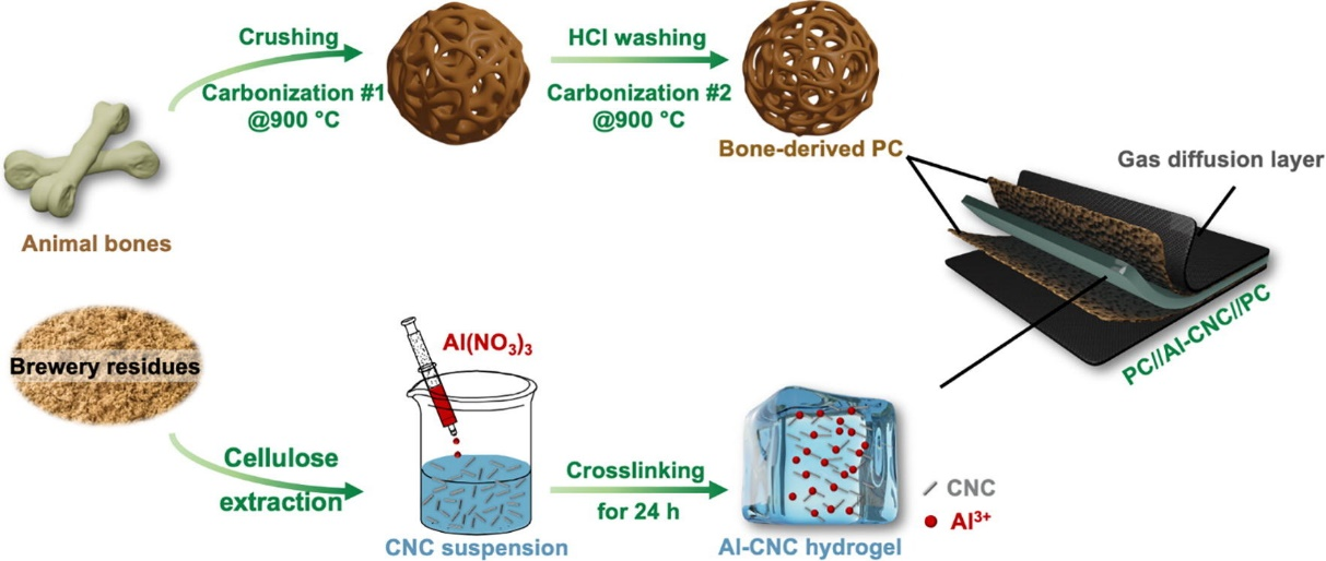 储能设备开发的主要挑战之一是与清洁技术相协调的材料选择。在此,研究人员从啤酒残渣中提取的纤维素纳米晶体 (CNC) 在与铝离子物理交联后用作透明水凝胶电解质。水凝胶电解质 (Al-CNC) 具有超高离子电导率(~24.9 mS cm-1)、高透光率(在550 nm波长下~92.9%)、出色的压缩强度(在70%应变下3.9 MPa)和耐受各种变形。同时,动物骨生物废料用于合成多孔碳(PC)电极,可有效提供出色的比电容(~804 F g-1 at 1 A g-1)。通过将Al-CNC水凝胶夹在两个骨衍生PC电极 (PC//Al-CNC//PC) 之间来组装完全可再生的柔性对称超级电容器。获得的柔性器件显示出高能量密度(18.2 Wh kg-1,1 425 W kg-1)、出色的功率密度(20 833 W kg-1,7.1 Wh kg-1)。在5 A g-1下6 000次循环后,电容保持率约为92%。相关研究以“Biowaste-derived electrode and electrolyte materials for flexible supercapacitors”为题目,发表在Chemical Engineering Journal上。DOI:10.1016/j.cej.2022.135058