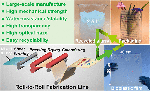 石化塑料堆积在地球上,对生态环境造成了极大威胁。近年来,纤维素薄膜因其良好的生物降解性、光学透明性和资源丰富性而成为替代石油基塑料的最具吸引力的候选材料之一。然而,制造纤维素薄膜的一般策略通常耗时且难以工业化。此外,这些薄膜在潮湿环境中仍存在抗水性差和机械强度差的缺点,不足以满足实际应用。在此,作者报道了一种简便且大规模的制备策略,用于制造由化学和物理双交联羧甲基化纤维素纤维 (CMF) 组成的高性能纤维素生物塑料薄膜。整个制备时间仅在1小时内,优于报道最多的方法。在这个过程中,漂白的软木牛皮纸浆被羧甲基化,形成均匀的带负电荷的CMF浆料,该浆料可以通过强静电相互作用进一步与聚酰胺环氧氯丙烷树脂或硫酸铝交联。由此产生的生物塑料显示出高机械强度 (158.2 MPa)、优异的水稳定性和改进的湿强度 (20.7 MPa)。此外,该生物塑料还具有高光学透明度 (89.4%) 和雾度特性 (77.9%)、良好的热稳定性和易于机械分解的可回收性。这种涉及简单造纸过程的快速、可扩展且低成本的策略为生产可回收和可持续的纤维素生物塑料提供了一条有前景的工业化路线,有可能在工程和包装方面取代石化塑料。相关研究以“Large-Scale Manufacture of Recyclable Bioplastics from Renewable Cellulosic Biomass Derived from Softwood Kraft Pulp”为题目,发表在ACS Applied Polymer Materials上。DOI:10.1021/acsapm.1c01729。