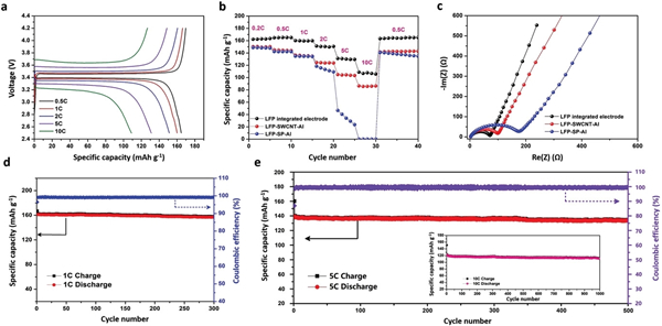 (b,c)LFP、LFP-SWCNT-Al和LFP-SP-Al电极的倍率性能(b)和EIS曲线(c);