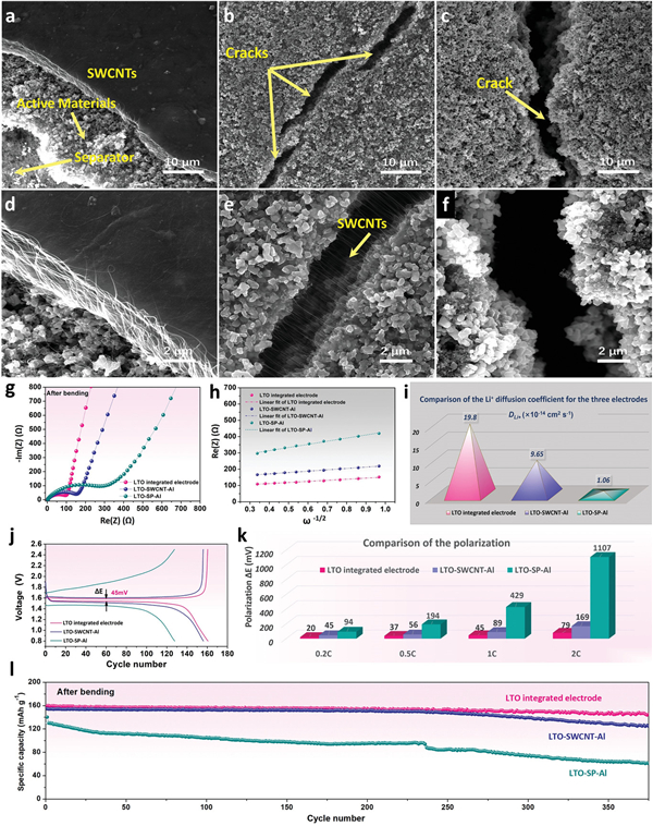 LTO-SWCNT-Al电极(b,e)和LTO-SP-Al电极(c,f);